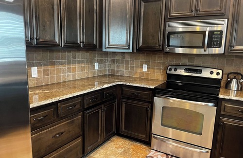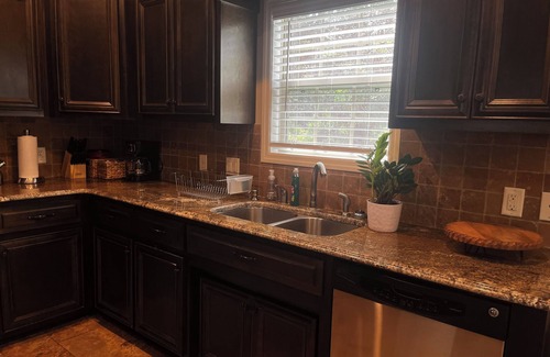 This brand-new 3-bedroom, 2-bathroom home offers the perfect blend of comfort and nature. With 4 queen beds and a queen sofa bed, this spacious retreat comfortably accommodates larger groups or families. Enjoy your morning coffee on the patio overlooking a peaceful pond, surrounded by stunning scenery. You'll find all the modern amenities, including a full kitchen, Wi-Fi, and smart TVs. Whether you're here to relax or explore, this home provides a tranquil base for your getaway.