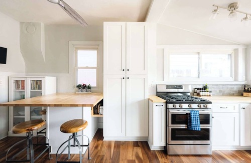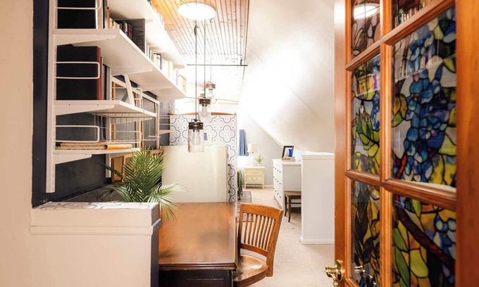 The cottage features two comfortable bedrooms: a queen suite with vaulted ceilings and a private en suite bathroom, and a second bedroom with a full bed and its own en suite bathroom complete with a soaking tub. Shelves lined with books throughout the home invite you to slow down and unwind, whether you’re sipping coffee in the sunlit kitchen or curling up in one of the cozy sitting areas. Out back, a peaceful yard shaded by flowering trees in the spring offers a quiet spot to relax after a day exploring the neighborhood.