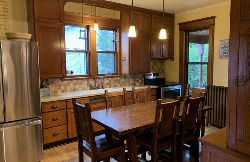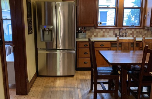 Your experience at the Charming Hilltop Home is enhanced by thoughtful amenities designed for comfort and celebration. Enjoy the warmth of two gas fireplaces on chilly evenings or prepare gourmet meals in the fully equipped kitchen featuring Kenmore Elite appliances. The outdoor space invites you to relax under twinkling lights in the quaint backyard, soak away your stress in the seasonal hot tub, or gather around a cozy fire on the brick patio. The spacious deck overlooking the city is perfect for dining al fresco, allowing you to savor breakfast, lunch, or dinner while soaking in the beautiful scenery.