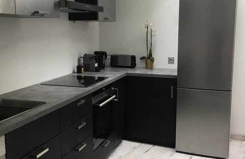 Four granite steps provide access to a bathroom with a toilet and the kitchen which is equipped with a fridge-freezer, an induction hob, an oven, a microwave as well than a large work plan. You can directly access the garden from this kitchen.