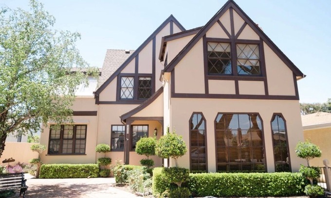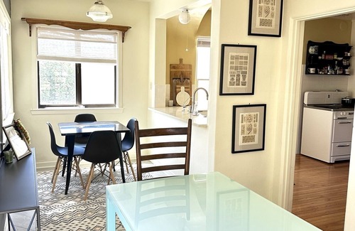 1930s Tudor style house with many original details. Decorated to reflect both the original era built and modern tastes, the house and fenced in yard are dog friendly. 4 Bedrooms and two beautifully tiled full bathrooms. Three of the bedrooms have queen beds and the upstairs front bedroom is set up with two twin beds for flexibility.