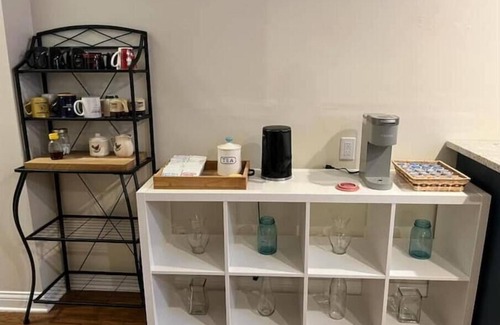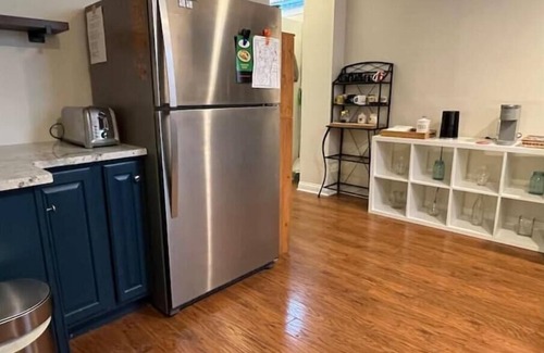 Full kitchen - gas oven and stovetop, full-size fridge, Keurig coffee maker with complimentary pods, hot water kettle and complimentary tea and hot chocolate, toaster, microwave, basic cookware (skillets, pots & pans, casserole dishes, cookie sheet), plates & bowls, drinking glasses & wine glasses, silverware, mugs