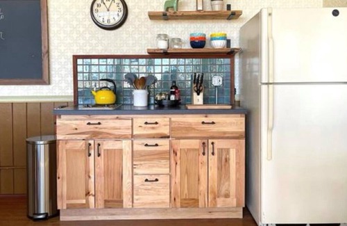 The Schoolhouse also has a kitchenette in the main room along with an adjoining pantry where you'll find everything you need to make a meal: a refrigerator, stove top, microwave, electric griddle, Kuerig coffeemaker, toaster, pans, utensils, and basic spices/seasonings.