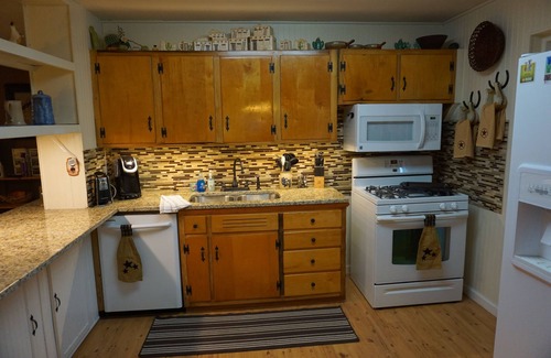 Kitchen is fully equipped with dishes, utensils, and appliances for making home cooked meals with granite countertops and tile backsplash.. Large covered deck in back with gas grill and plenty of seating to relax and enjoy your vacation and time with family.