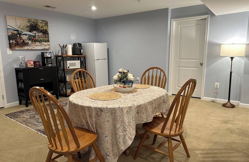 Escape to your home away from home at this beautifully newly remodeled walk out basement, with plenty of space and filled with exquisite artwork. There is a spacious stylish bedroom, as well as a lovely living room and dining area. The master bed and sofa are both extremely comfortable and the perfect place to unwind and rest. The kitchenette provides everything needed for a delicious meal, including a refrigerator, air fryer, coffee maker, microwave, and toaster. Charmingly decorated and sure to make you feel right at home! There is also a nice backyard area, and a grassy path that leads to your private entrance. This guest suite unit is the perfect place to unwind. Fall in love with this ideal getaway, our place will help you feel at home while you're traveling in Odenton!