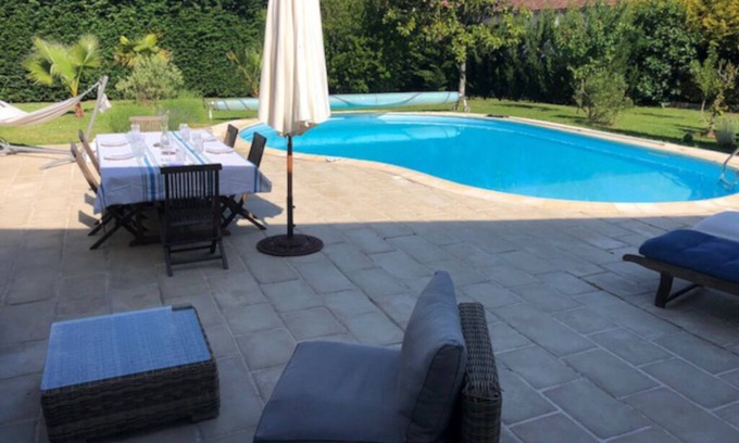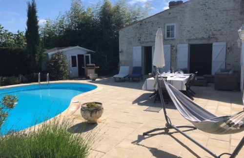 Charm of a large stone house (315 m2) in the middle of the vineyards of Cognac, with a swimming pool of 10 m by 6 m (with a summer tarp that keeps the water at 26° and an alarm) on a walled garden of 1100 m2, with a terrace-beach around the pool (55 m2). The house is located in Saint Grégoire d'Ardennes (17240) in a peaceful hamlet, surrounded by vineyards and forest, 9 km from Jonzac, a pretty spa town, 30 km from Cognac and 40 km from the sea (Royan), one hour from Bordeaux and La Rochelle and finally 10 km from the A10. It consists of a large cathedral living room (100 m2) with monumental fireplace, a master suite with a four-poster bed (1.60 x 2.00) and two other large double bedrooms (1.80 x 2.00), two bathrooms and 3 toilets. An extra bed (1.80 x 2 m) in the games room allows you to move from 6 to 8 beds. Rental in July and August, has the week exclusively. New fully equipped kitchen with washing machine dishes and back kitchen with washing machines and drying clothes. Games room. Private parking for 2 cars. Sheets and towels and pool provided. 2 TVs and high speed internet by optical fiber. Cleaning fee of 100 euros extra. Deposit cheque of 500 euros not cashed. Tourist tax: 1.40 € per day and per adult. RC Resort Insurance requested.