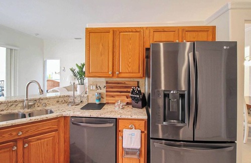Step outside to the large patio, perfect for enjoying meals with family and friends. The living room provides a relaxing retreat after a day of adventure, and the kitchen, with updated appliances, is perfect for preparing your favorite treats. Wexford On The Green offers a delightful setting for your Venice getaway!