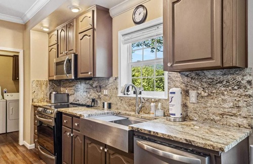 Stunning Outdoor Areas: Enjoy two expansive rear decks equipped for outdoor dining and relaxation while taking in breathtaking mountain views. These serene spaces are perfect for pre-wedding gatherings or casual afternoon BBQs during your stay.