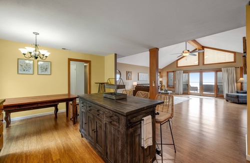 A wood-burning fireplace provides a cozy centerpiece for group gatherings in the living area and a smart TV is equipped for streaming shows or movies. The full kitchen is well-appointed with all the major appliances and cookware needed for easy meal prep. Free WiFi is available throughout the home for web browsing or remote working.