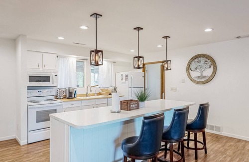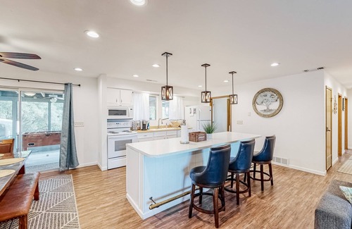 Inside you'll find a bright and welcoming interior, full of natural light. There's plenty of comfortable furniture to rest on, especially around the stone fireplace with a wall-mounted TV, perfect for movie nights or Netflix marathons (guests must log in using their own credentials). The open-concept floor plan puts the living area, dining area, and kitchen adjacent to each other, so nobody has to miss out on great conversation. Enjoy playing board games or eating grand meals at the large dining table. The chef of the party will love cooking in the full kitchen, where there is a breakfast bar that seats three. The floating island has all the drawers and cupboards you could ever need! The main suite has a large, soft bed, plenty of closet space for personal effects, and an en-suite bathroom with a roomy shower. The other guest bedrooms also have soft beds and plenty of space to keep personal effects. Challenge your friends or loved ones to a game of billiards or foosball, or just chill out and make memories. Sit around the fire pit and tell ghost stories at night, or watch the California sunrise sipping your morning coffee.