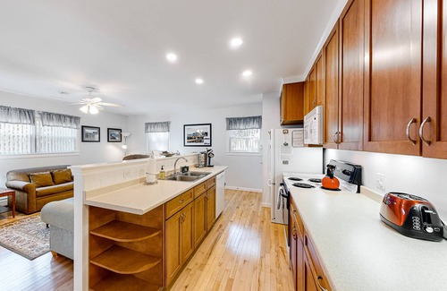 An extraordinary stay awaits at this quaint vacation home. You'll enjoy your vacation in an incredible downtown location, with comfortable air conditioning and both WiFi and cable. You'll love being located steps from all the incredible shopping, dining, and activities Bar Harbor has to offer while being within a short driving distance of fantastic trails, parks, and water sports like kayaking. The interior is bright and spacious, outfitted with comfortable furniture, a large TV, and glossy wood floors. After a fun day of exploring, come home to take advantage of the full kitchen to prepare your favorite meals for everyone to enjoy at the dining table with seating for four. The stacked washer/dryer will ensure everyone looks their best during your stay.