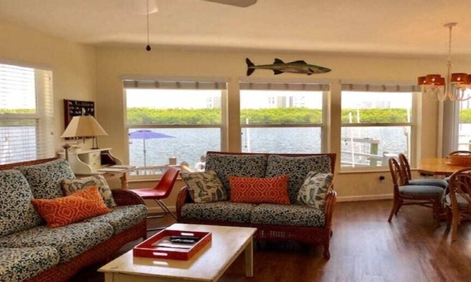 Soothing island colors and comfortable 'beach' decor will welcome you as you enter the cottage. A wall of windows in the family room and kitchen provides a serene view of the waterway and private dock on the quiet East seawall of Nettles Island. It is not uncommon to see dolphins in the morning, many varieties of birds, fish jumping out of the water and occasionally a manatee. The private dock for fishing or leisure time is just a few steps out the back sliding door. Walk, bike or use golf cart 1/2 mile through the Resort and across Ocean Drive to the Nettles Island private beach access, ocean pool and snack bar.