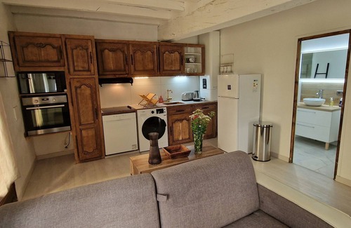 The kitchen is fully equipped: induction hob, microwave, oven, kettle, toaster, fridge, freezer, dishwasher, washing machine, etc...