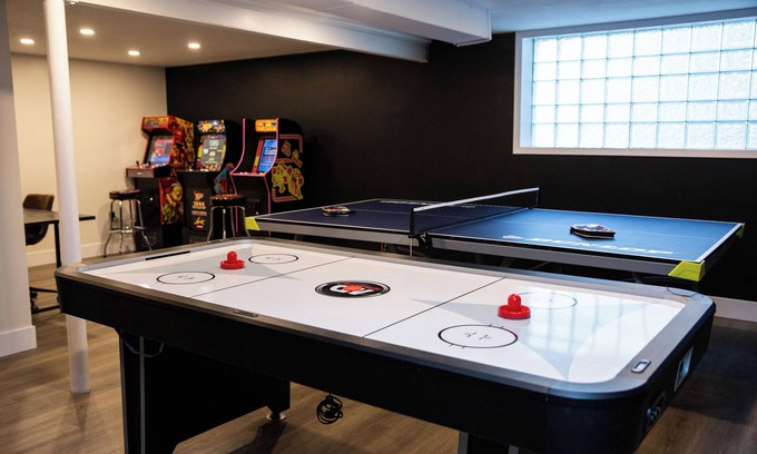 Nestled in a peaceful neighborhood, this enchanting property offers 3 queen beds, 2 bathrooms with a bathtub and shower, and a cozy living room with a sofa bed. Enjoy your own private cinema and a game room with free arcades, perfect for entertainment and relaxation. Stay connected with WiFi, and enjoy year-round comfort with AC and heating.