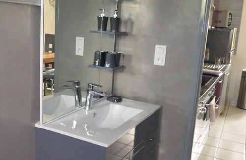 - Laundry with washing machine, iron and ironing board and a water point.