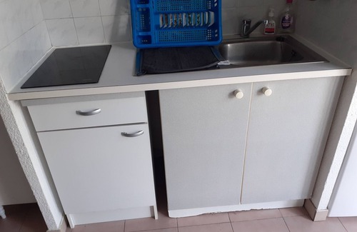 Composed on the ground floor: living room with sofa bed; dining room with table + chairs and TV; fitted kitchen (fridge + freezer, induction hob, coffee maker, toaster, microwave, electric oven and washing machine).