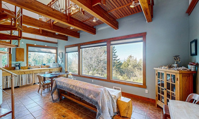This house offers Port Orford cedar throughout, giving it a warm ambience. On the main level you'll find a full kitchen, a living area, and a master bedroom with a private deck that's great for watching the sunset over the ocean. Climb the spiral staircase and you'll reach the loft space, with twin beds and a library of books. There's also a gangplank leading to an indoor deck feature, which offers a nook with windows looking out to the ocean and the Port Orford Reef. With free WiFi throughout the home and many forms of wildlife outside your window, you'll have plenty to keep you entertained. The family dog is also welcome!
