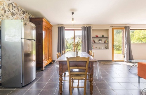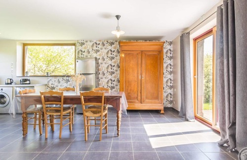 Detached single-story house. Living room (TV with foreign channels, books). Kitchen open to the living room (cooker with induction hob and electric oven, extractor, microwave, dishwasher, freezer compartment, washing machine and dryer). Bedroom 1 (140x190 bed). Bedroom 2 (2 beds 90x190 + wardrobe). Shower room with WC (sink, Italian shower, heated towel rail and hairdryer). Unfenced grounds. Independent garden. Courtyard with parking for several vehicles. South-facing terrace. Garden furniture. Parasol. Deckchairs. Barbecue. Electric underfloor heating at an additional cost (package). Bed linen and towels for hire. Cleaning optional. High chair on request. Located a few kilometers from the emblematic tourist sites of the South Manche (notably Mont-Saint-Michel and its Bay), this rental is an ideal starting point for exploring the cultural and natural riches. For lovers of nature and the countryside, this house, built with old materials, offers a setting conducive to relaxation and country walks. Spacious and bright, it combines old-world charm with modern comforts, and you'll appreciate its warm interior and inviting living spaces. Outside, the sunny garden and terrace will allow you to fully enjoy the beautiful weather.