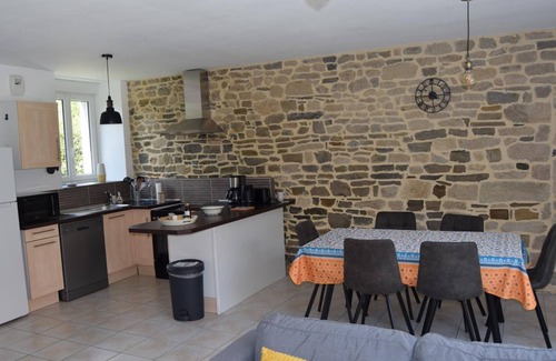 House adjoining a house. Living room (TV, Wi-Fi) with equipped kitchen area (oven, induction hob, fridge with freezer, dishwasher, microwave). Separate toilet. Storage room. Upstairs, shower room (washing machine) with toilet, bedroom 1 (1 bed 160x200), bedroom 2 (2 beds 90x190) and on the mezzanine landing a convertible sofa (BZ type) with library corner. Baby equipment on request. Sheets and towels for hire. Cleaning service at an additional cost. Electric heating included. All charges included. Enclosed courtyard and private enclosed garden. Terrace. Garden furniture. Barbecue. Deckchairs. Awning for garage. Parking. Set back from the seaside resort, this comfortable cottage is in the heart of a small rural hamlet and is ideally located to enjoy seaside leisure activities while being in a peaceful environment. You can enjoy the large terrace behind the house and its shade sail. A few steps lead to a pleasant, enclosed, flower-filled garden. The spacious living room is particularly popular, thanks to its light and its charming exposed stone wall. The long sandy beach of Jullouville-les-Pins awaits you, not to mention the must-see attractions of Granville harbor or Mont St-Michel!