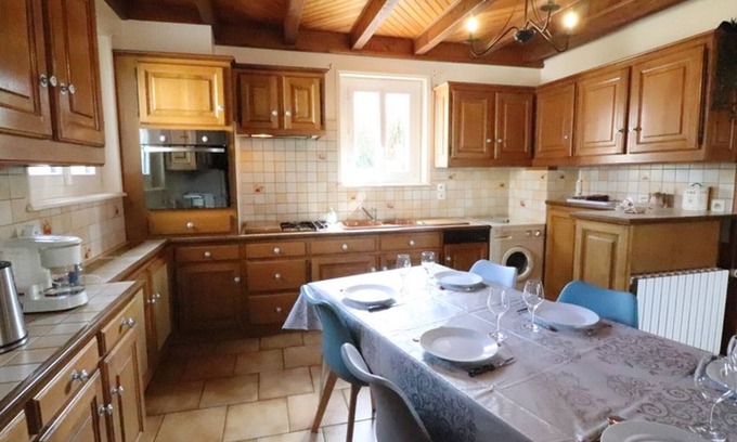 On the ground floor, living room with stove (free wood), flat screen TV, Wi-Fi internet access, fitted kitchen area and separate toilet. Upstairs, 1 bedroom with 1 bed 160X200, 1 bedroom with 3 single beds, shower room with toilet. Central heating wood included. Prices all charges included.