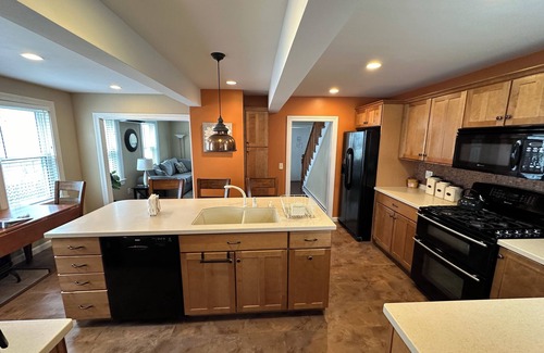 The home has been updated, nicely decorated and has three upstairs bedrooms with a full bath. There is a king bed in the master bedroom, a second bedroom with two twin beds, and bunk beds for the kids in the third bedroom. All three bedrooms have AC units. The first floor contains a lovely living room with sectional sofa, an updated kitchen with a large eat-in island, an additional side table for two, and a full bathroom and a laundry area with washer and dryer. There is also an AC downstairs as well. The outside back deck has a nice dining table and gas grill, as well as a fenced in yard. There is a covered front porch and a private driveway for parking.