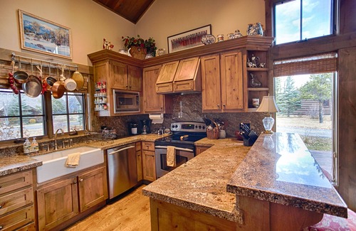 The stunning great room features an open floor plan including living room, dining area, and kitchen with floor-to-ceiling windows, magnificent rock fireplace (firewood provided), beamed ceiling, wood plank floors, 60" flat screen TV, elk antler chandelier over the dining room table, and a high end, fully-stocked kitchen with marble counters and swivel barstools. The master bedroom has a king bed, flat-screen TV, and en-suite bathroom with double vanity, jetted tub and glassed-in shower, while the guest bedroom includes a queen bed and en-suite bathroom with double vanity and walk-in shower. There is also a powder room, laundry room, and garage and extra parking space. Redwood decks, complete with gas grill and patio furniture, encircle the property on three sides, ensuring lots of extra space for enjoying the great outdoors. The entire home is beautifully furnished in a tasteful western style, and stays comfortably cool in the summer and delightfully cozy in the winter (think flannel sheets and down comforters). It is charmingly landscaped with aspens, pines, and cottonwoods, along with wildflower baskets in the summer and piles of legendary powder snow in the winter. And, if you're lucky, you just may see moose, elk, buffalo and other wildlife wandering around the neighborhood or taking a nap on the lawn.