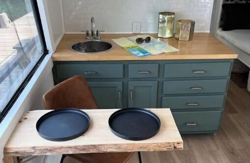 42' houseboat with covered deck off kitchen to enjoy your morning coffee, as well as a back patio with access to rooftop lounge. The houseboat does stay docked but there are 2 kayaks available to get around the lake. Inside, you will find a full pullout couch bed, a kitchen with hotplate, microwave, full fridge, coffee maker and all the kitchen basics you will need to have a great stay. Bathroom with shower in the hall across from 2 cozy bunks. Full bed in private bedroom.
