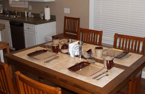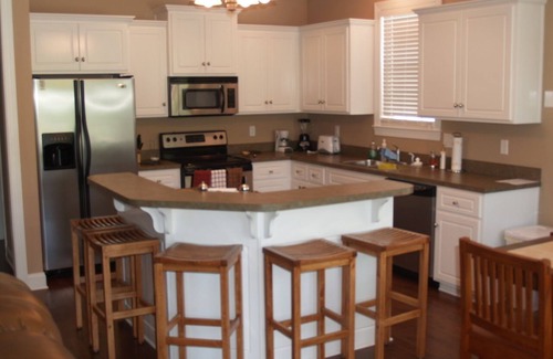 Down stairs you will find a high ceiling great room with hardwood floor connected to a dining area and full kitchen with an island bar. Above the gas log fireplace is a satellite HDTV (1080p) with Blu ray DVD and surround sound system. A comfy leather sofa and love seat with built in recliners will let you relax while enjoying a movie from our DVD selection.