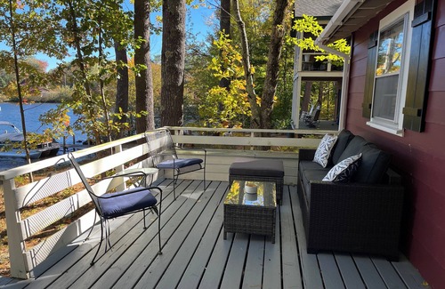 Our recently updated 2 bedroom, 1 bath cottage on Lake Kanasatka in Moultonborough,NH is perfect for a peaceful getaway. We have 80ft of a sandy walk-in beach and a private dock for your boat or to just catch some fish. Take a tour of the lake in the kayaks or canoe available for use and keep your eyes peeled for the bald eagles and loons. There is an expansive outdoor deck with an outdoor couch and chairs, dining table and a gas grill that is ideal for dining and relaxing while watching all the activity on the lake. Take your morning coffee or afternoon cocktail down to the Adirondack chairs near the water and enjoy the stunning views of the lake and Red Hill. Enjoy cooking s’mores and stargazing while sitting next to a cozy fire in the large stone fire pit every night.