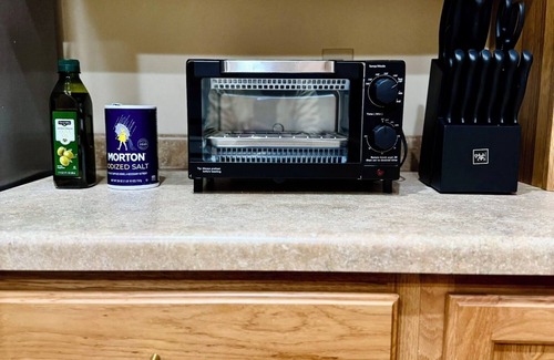 Inside, the warm pine-wood interior creates a cozy, inviting atmosphere. The open-concept living area blends modern décor with rustic charm, while the fully equipped kitchen provides everything you need, including a blender, air fryer, toaster oven, and coffee machine.