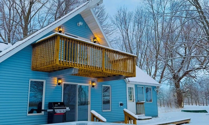 Escape to this exclusive lakefront A-frame cabin, where you can wake up to breathtaking sunrises, stargaze by the campfire, and soak in a brand-new 7-person hot tub with panoramic lake views. Nestled on 2 secluded acres, this cozy retreat features a private balcony, Weber grill, and modern rustic charm. Just 5 min from North Bay Shore Recreation Area, with hiking trails, boat launch, and picnic spots. Perfect for families, couples, and nature lovers.