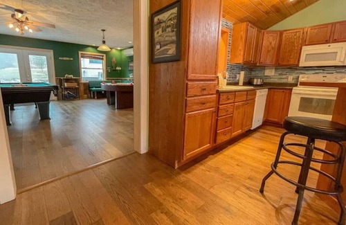Inside the house, you'll find all the amenities you need for a comfortable stay, including bathroom essentials, a fully equipped kitchen (Lobster pot included!), comfortable living room with large sofa, and a dining area that overlooks the lake. With a newly installed reverse osmosis water filtration system, we can proudly offer all our guests clean drinking water, too. There's also plenty of space to unwind in the parlor with a bar, pool table, and air hockey table. Enjoy quality time with loved ones, whether you're playing board games, shooting pool, or watching movies.