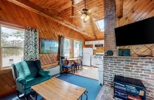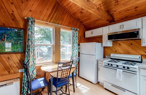 This single-level cottage is part of the Sebago Lake Lodge and Cottages, a property with 700 feet of lake frontage, swimming and docking areas, canoes to take out on the water, a fitness room, and picnic areas. As for this particular lakefront cottage, you'll enter by way of a screened front porch, where you can admire the lake as sip your coffee in the mornings. The interior is both classic and comfortable, offering wood-paneled walls and ceilings, skylights that let in the sunshine, and large windows that frame the lake outside. Begin each beautiful day by taking a canoe out on Sebago Lake Basin, Jordan Bay, or Sebago Lake, returning home to prepare a homemade breakfast in the full kitchen and sit down to eat inside or out on the screened porch.