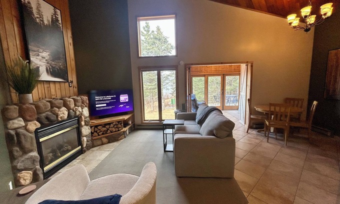 This Lakehome is located at the Lakehomes at Superior Shores, a property adjacent but not affiliated with Superior Shores Resort, and offers wonderful views of Flood Bay. You are just steps away from water with natural rock beaches and ledges. Onsite amenities include a pool and hot tub (seasonal), walking trails, and a tennis / basketball court. This unit comes fully stocked and ready for your visit. As shown in the floor plan pictures, this Lakehome is a two bedroom single level unit with direct access to the shore from the deck. The unit offers three sleeping areas a private primary bedroom by the entry (king bed), a private bedroom with direct access to the deck (queen bed), and a queen sized convertible sofa in the living room. The unit contains a bathroom including a full tub / shower and a washer and dryer in the primary bedroom . A natural gas fireplace keeps the place cozy in the winter, ample windows allow a cool lake air breeze in the summer, and a mini-split AC/heat system in the living room. The spacious deck includes a grill and a patio table with seating for four. New for 2025: For more transparent pricing, there are no additional fees for cleaning or amenities.