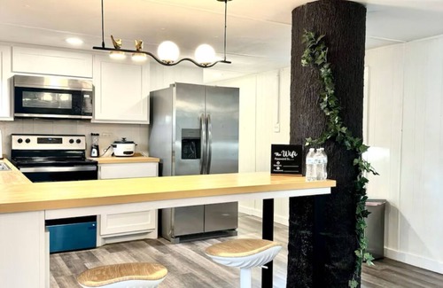 Modern Kitchen: The kitchen is equipped with stainless steel appliances and offers direct views of the lake and woods. It features a unique artificial aesthetic with tree bark accents, creating a blend of modern functionality and natural charm. Highchairs at the bar setting, decorated with artificial tree bark, enhance the rustic and earthy feeling. A bar counter provides a perfect spot to chill with friends, adding to the inviting atmosphere of the living room.