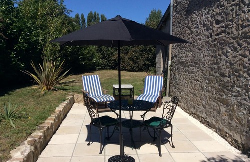 Recently renovated stone cottage within the grounds of a "maison de mâitre" with its own terrace and garden. The house has been designed with style and comfort in mind. The bright living room is on the first floor and the evening sun pours in through the large window. There is electric heating as well as a wood burner for the winter. The bedroom on the ground floor has a king size bed and a spacious shower room across the hallway.
