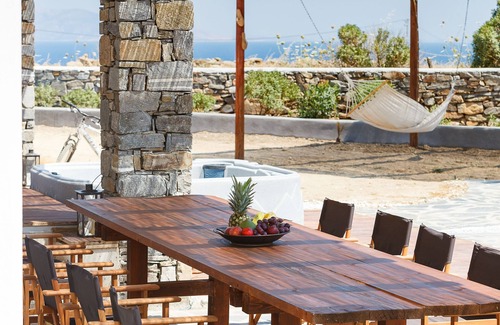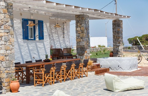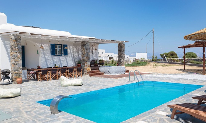 Fantastic authentic Cycladean summer living in this recently-built and superbly interior designed 2-bedroom home, boasting direct views towards the sea and the island of Naxos, plus its own private pool and limited use of a Jacuzzi. It artfully combines local traditional elements with a minimal modern design, creating a space perfect for summer chilling. Up to 6 people can be accommodated in 2 double beds and 2 comfy built single sofa beds in the living room. Its outdoor spaces are simply super!