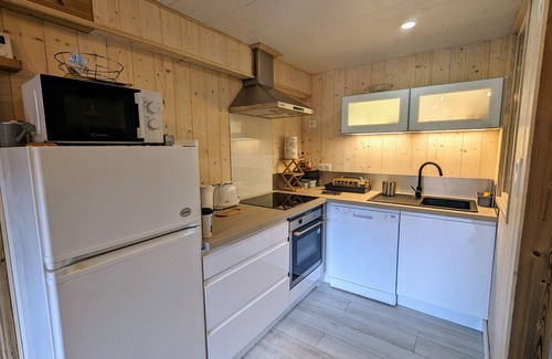 Equipped kitchen with fridge, freezer, induction hob, built-in oven, dishwasher, kettle, toaster, coffee maker.