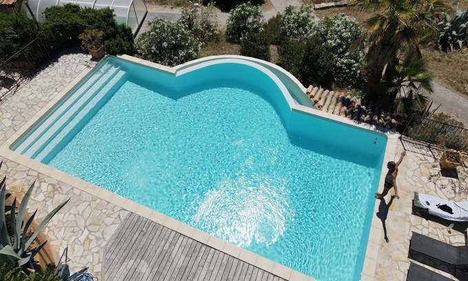 Peace and quiet, surrounded by pine and olive trees, 3 km from the sea, set in 10,000 m² of grounds with a large infinity pool (12 x 6) with relaxation areas and sun loungers. Heated, open-air swimming spa.