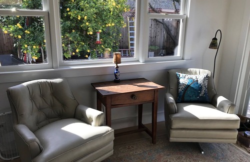 Convenient to CalTrain, all freeways, Stanford, Menlo Park, & Palo Alto. Our home has been extensively renovated with alarm system, heat, aircon, and high-end kitchen appliances. There is a pantry/laundry shed off the kitchen with new W/D with sanitize settings and extra freezer/fridge. This house is perfect for healthcare workers, families with children, faculty, or finance and tech consultants. The two bedrooms are at opposite ends of the house, which works well for sharing the house with family and friends. The living room, dining room and kitchen in the center of the home. Bedrooms have medium firm, top quality, king and queen mattresses and organic linens. Both bathrooms have been remodeled. One with shower over tub, the other bathroom has a walk in, no threshold shower and lighted granite niche. Large, fenced, completely private lawn, garden and patio with South and West exposure. Perfect for watching the sunset. There is an outdoor shower and large soaking tub (AKA horse trough) with water that drains on fruit trees. Kids and pets welcome with their lovely owners. Off street parking for 4 cars right in front of house, and one lockable parking space behind front gate. Bring your charging cable for our lockable EV Level 1 charger. Inquire for code.