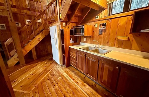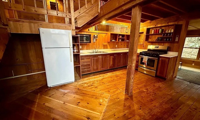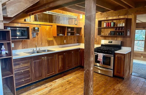 The house has two bedrooms and one bath, with over 2,400 square feet to relax. Enjoy the mountain, sitting on the deck, watching the deer grab apples off the trees, or hiking in our woods. The property is located near three trails accessible by horses or on foot.