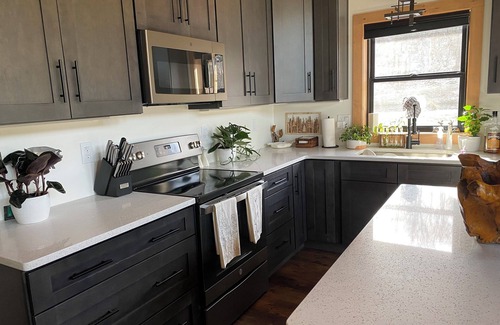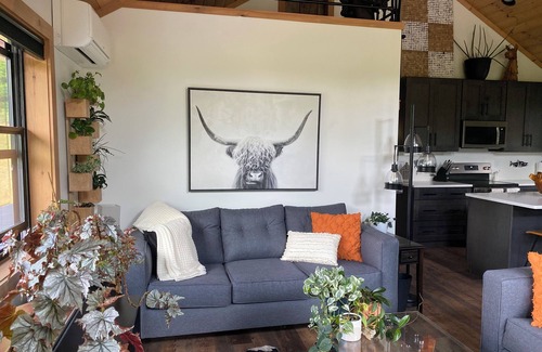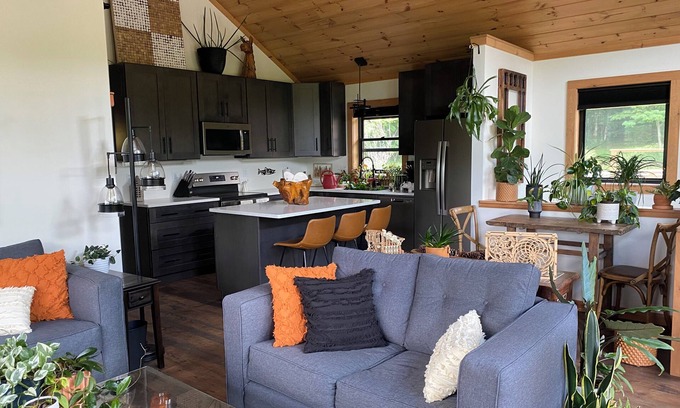Escape to a luxurious and immaculate barn home in Roan Mountain for a relaxing getaway. This stunning 2 bedroom + loft retreat features a full kitchen with quartz countertops, spacious king bed in the main bedroom and a convenient full size sofa bed in the second bedroom which also includes a desk with keyboard, mouse and monitor. The beautiful gas fireplace for the chilly evenings, heating and A/C, high speed WiFi, fully appointed kitchen, and washer and dryer, ensure guests can feel right at home. A large smart TV and sound system allows you to enjoy movies and entertainment. Sit on the spacious deck and listen to creek and watch the bountiful wildlife attracted by the pond. The bathroom offers a refreshing shower and a hairdryer for added convenience. One of the most beautiful sections of the Appalachian Trail is only a 15 minute drive away. We are 5 minutes above the beautiful Roan Mountain State Park. Many popular attractions like Grandfather Mountain, Linville Falls, Banner Elk, Boone, Sugar Mountain, Beech Mountain, Watagua Lake, wineries ensure you have easy access to year round entertainment but you can enjoy the solitude and quiet of this beautiful retreat. It's easy to see why you'll be able to unwind at Firefly Holler. AWD or 4WD vehicles are strongly recommended in winter.