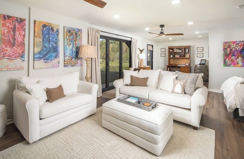 Wake up to breathtaking sunrises over the fully stocked pond and enjoy your morning coffee on the deck. The outdoor space is perfect for soaking in the serene surroundings, whether lounging at the firepit or grilling dinner under the stars.