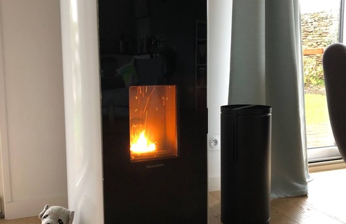 Our cottage "Bleu Vert" between Gulf and Ocean is located in the center of Sarzeau Bourg, shops and market 2 steps, Gulf path 300 m. The beaches of the ocean are 4 km away. As a couple or with two children, this new building on one level will certainly seduce you. The living space has a sitting area with sofa and fireside, a TV with coffee table and a pellet stove. The kitchen is equipped with an oven, hob, dishwasher, refrigerator, microwave and the essentials in cookware, crockery and cutlery. The sleeping area consists of a bedroom with bed 160 x200 and a double room 90x190 each with wardrobe closet. Linens provided. Shower room and separate toilet. The outdoor area includes a west-facing terrace with garden furniture, all open onto the landscaped garden of the owners.