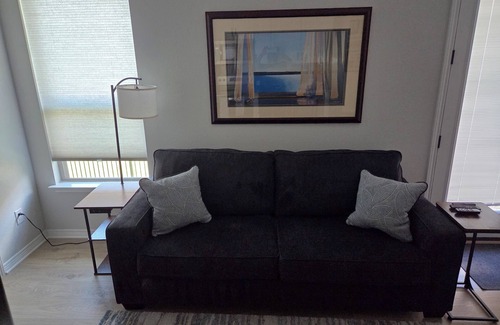 1) Kitchen: Pots, Pans, Silverware, Plates, Glasses, Cups, Keurig for coffee/tea, salt/pepper 42" TV with cable and live-streaming. Queen Sofa Bed.