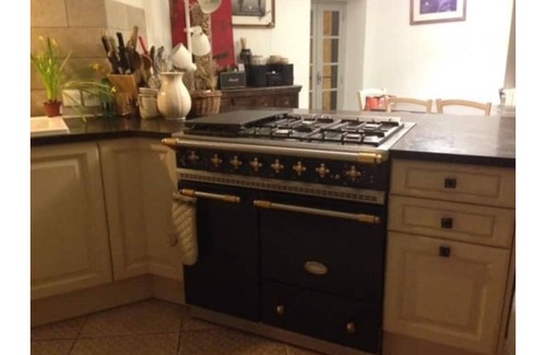 - An open kitchen, fully equipped (6-burner Gas Piano brand Lacanche ..... Dishwasher, Microwave, Filter coffee maker. Music access). A table for 6 people for the kitchen. The kitchen has 3 windows. One of which overlooks the medieval porch of the 11th century