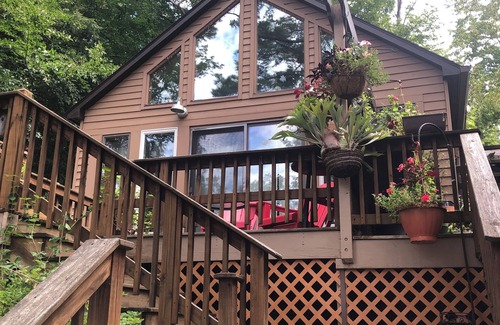 Cozy Adirondack style cabin with knotty pine paneling in living room with comfortable denim sofa and chair and a full size futon perfect for one. Adirondack dining set for 3 sits in front of a lake scene wall mural. Bedroom with Cathedral ceiling includes a Queen size bed, ceiling fan and expansive windows over looking the lake. Cedar paneled bathroom with shower. Full Kitchen with stove, oven, dishwasher, microwave, coffee maker, toaster. Multiple decks, and pergola dining area overlooking the Lake with gas grill. Large floating Dock at lakeside is perfect for swimming, sunning and fishing. Front yard has abundant flowers and Koi pond. Peaceful, quiet and only minutes from Interstate 88 and Downtown Oneonta; 12 minutes to Cooperstown All Star Village, and Cooperstown Dreams Park and 20 minutes from Cooperstown with Baseball and Museums to explore. Linens provided. Kayaks are available to use. Private entrance ( owners on premise) and parking for one car. Heat and Air Conditioned. ***SUMMER 2026: we have a 6 day minimum scheduled for guests staying at Cooperstown All Star Village only.
