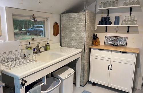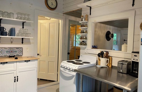 On the 1st floor, there’s a well-equipped kitchen with original pantry and farmhouse sink; a full bathroom with new shower; and a living room with direct access to the large screened-in porch and deck overlooking the lake. The view from the porch is mesmerizing; from your perch among the trees (you'll feel like you're in a treehouse!), you can listen to the loons while you drink your morning coffee, read a book, dine at the country-style table or play board games, and take in the beautiful sunsets in the evening. For chilly mornings, there is a heater in the living room that warms the first floor up in minutes.