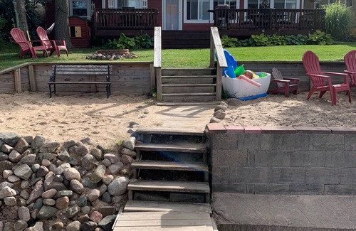 On the south shore of Pratt Lake, in the community of Gladwin, MI sits our fun filled red 2BR lodge style cottage with granite counters in kitchen and knotty pine throughout on 50 feet of water frontage. Pack your swimsuits cause you will need it as the sandy beach is great to swim and play. Pratt lake is great for your skiboat, waterskis, tubes, pontoon, kayaks or jet skis to play on all of the 180 acres Pratt Lake offers! Relax at the picnic table or sit and gaze at the lake from the deck. Grab a book and read in the sand. Enjoy the beach and great views of Pratt Lake. Pack your 'Smores' for the outdoor fire pit. Fish from the 40 foot dock. Public boat launch down the street to launch all of your toys. Plenty of room to secure your boat on the dock. Canoe and Row boat included for use. Clear water - great swimming. Water depth at our shoreline increases gradually - good for children (we have 4, so its actively used!). Firm, clean bottom. If you like to fish there is good pan fish, bass, and pike fishing. A few walleyes are caught each year as well. If the fishing is tough, take a trip to downtown Gladwin and hit the trout pond! Light boat traffic except on holiday weekends. Our cottage was built in the 20s and was one of the original cabins on Pratt Lake. It has a full kitchen with granite and dishwasher with all of the pots/pan/cookware amenities, 1 full bath room with tile floor, a large living room, lodge style knotty pine walls. Dark bamboo hardwood floors. There are three queen beds along with one sleeper sofa. Very open kitchen/ dining/sun room view looks out over beautiful views of the Lake.