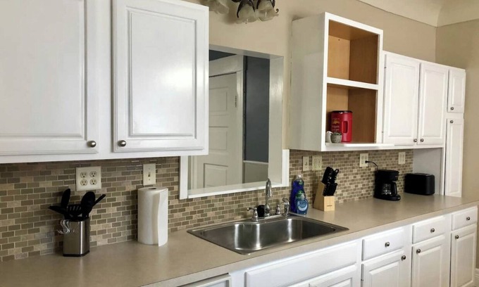 Our home sleeps 4. Featuring a queen bed and sleeper sofa. In addition, we have an inviting and fully stocked kitchen available to use, a desk for anyone traveling for work or working or schooling remotely, private patio, and a living room with Smart TV for streaming your favorite shows and movies!